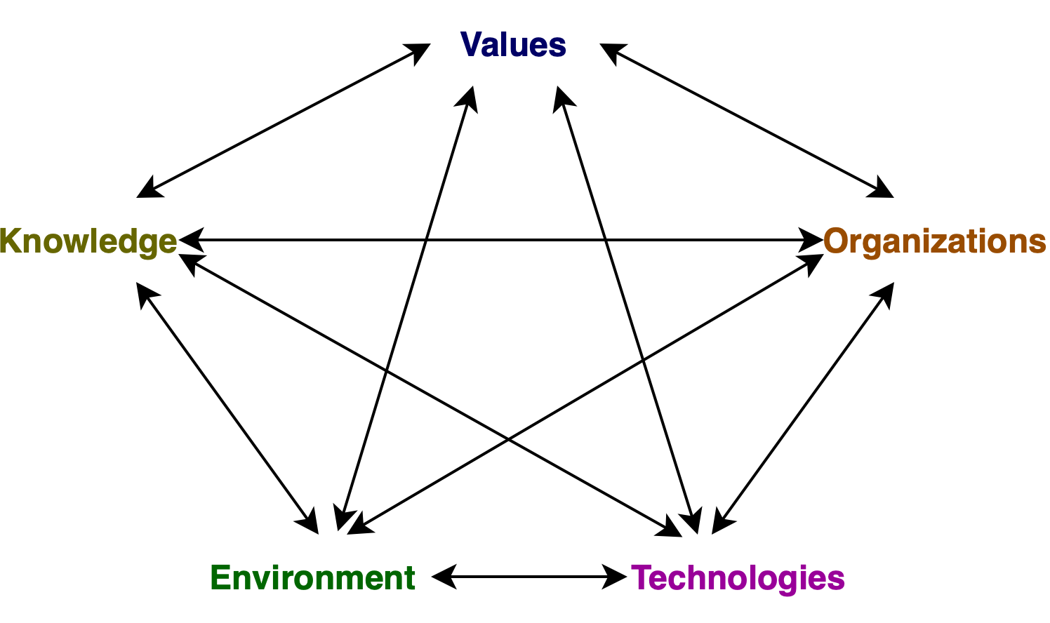 By understating how social systems have coevolved with ecological systems, we can learn to appreciate, preserve and adapt traditional cultures to an ecological economic way of thinking and thus increase the chances of achieving sustainability. The diagram below shows how our values coevolve with our knowledge, organization and the environment and technologies that ultimately enable our well-being.