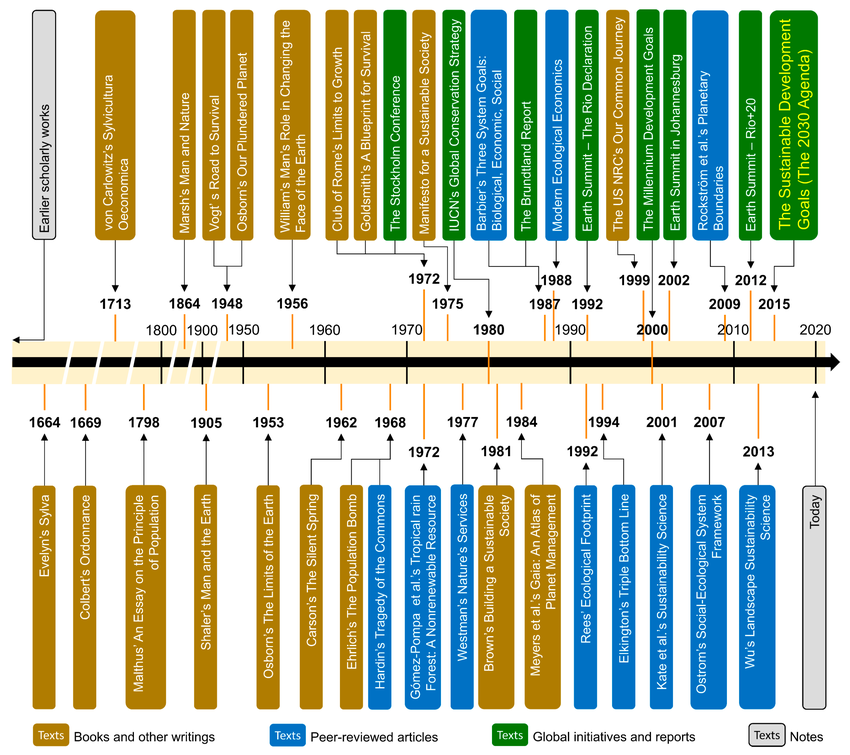 Timeline showing how the sustainability concept has been advanced by scholarly works and global policy initiatives amid the rise of modern ecological economics. Source: Estoque, 2020.