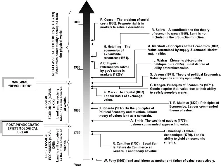 This timeline shows some of the major turning points in the evolution of how economics has conceptualized the role of its biophysical foundation and its embeddedness to the rest of nature for that matter. Source: Gómez-Baggethun et al., 2010.