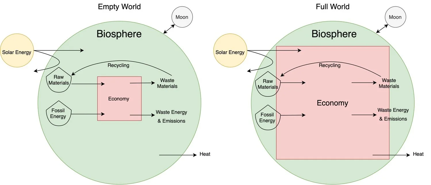 Society has shifted from an empty world where human populations and consumption levels were too small to have significant impacts on vital ecosystem functions, to a full world where the goal of economic growth leads to massive transfers of wealth to the few at the top, while it undermines the wellbeing of society and the rest of nature.